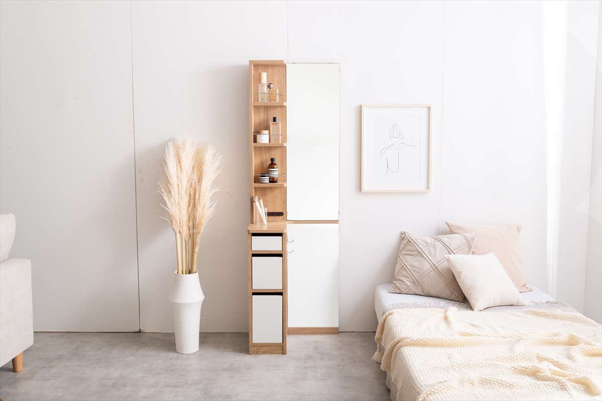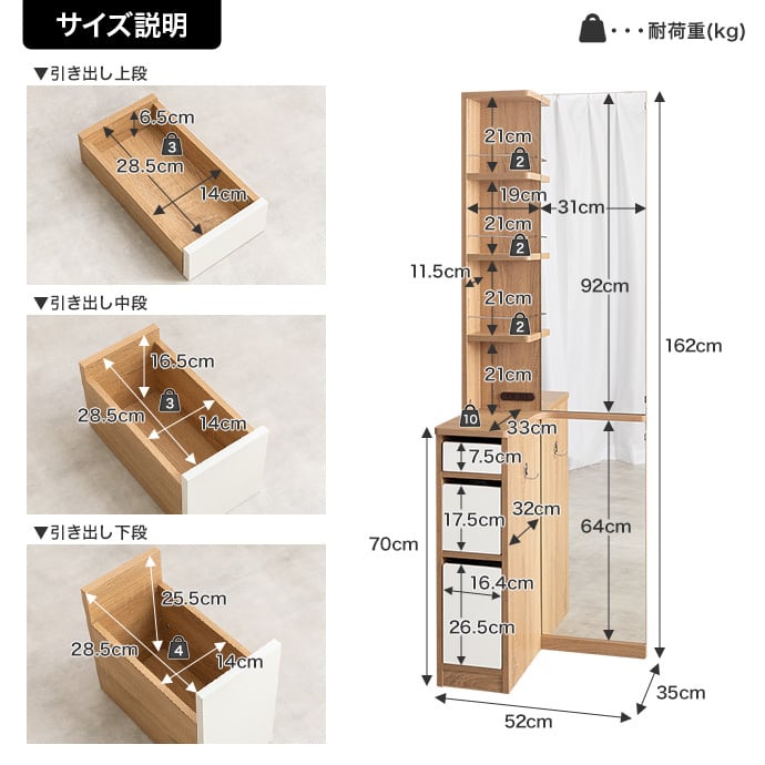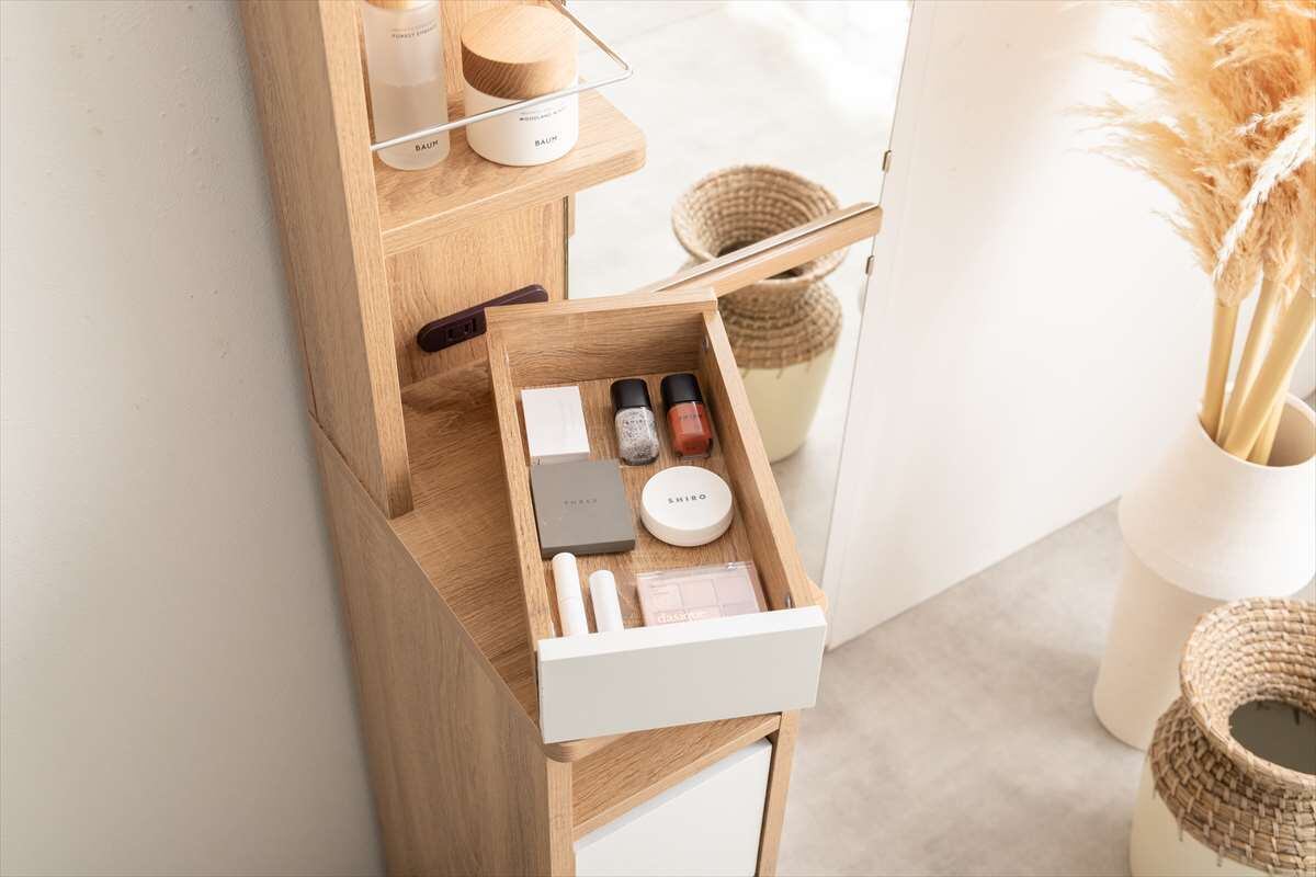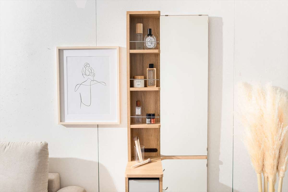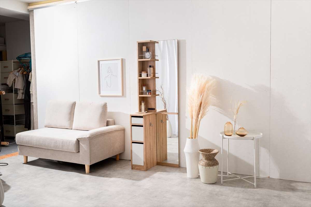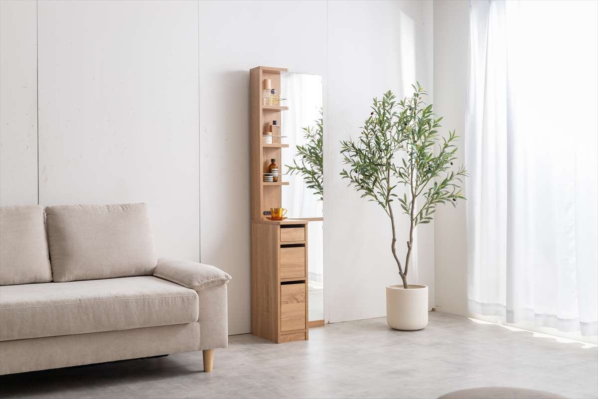 すっきりとしたデザインの収納付 姿見ドレッサーは、お部屋に高級感をもたらします。大きな鏡で身だしなみを整えながら、引き出しや棚に必要なアイテムをまとめて収納できる便利さを兼ね備えています。毎日の身支度を快適にサポートし、洗練された雰囲気を演出するこのドレッサーは、どんなインテリアとも調和する優れたアイテムです!あなたのおしゃれな生活をより一層引き立ててくれることでしょう!