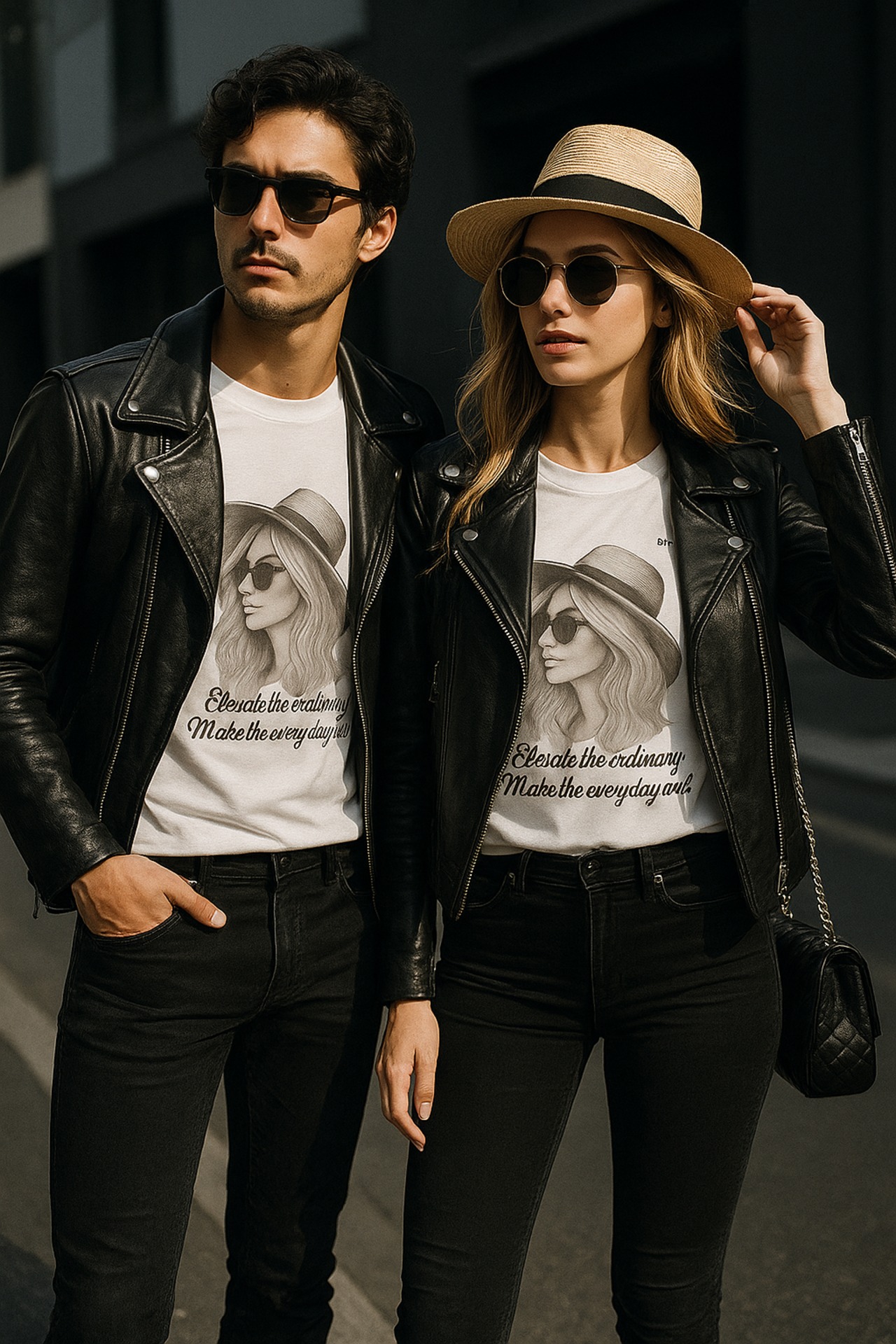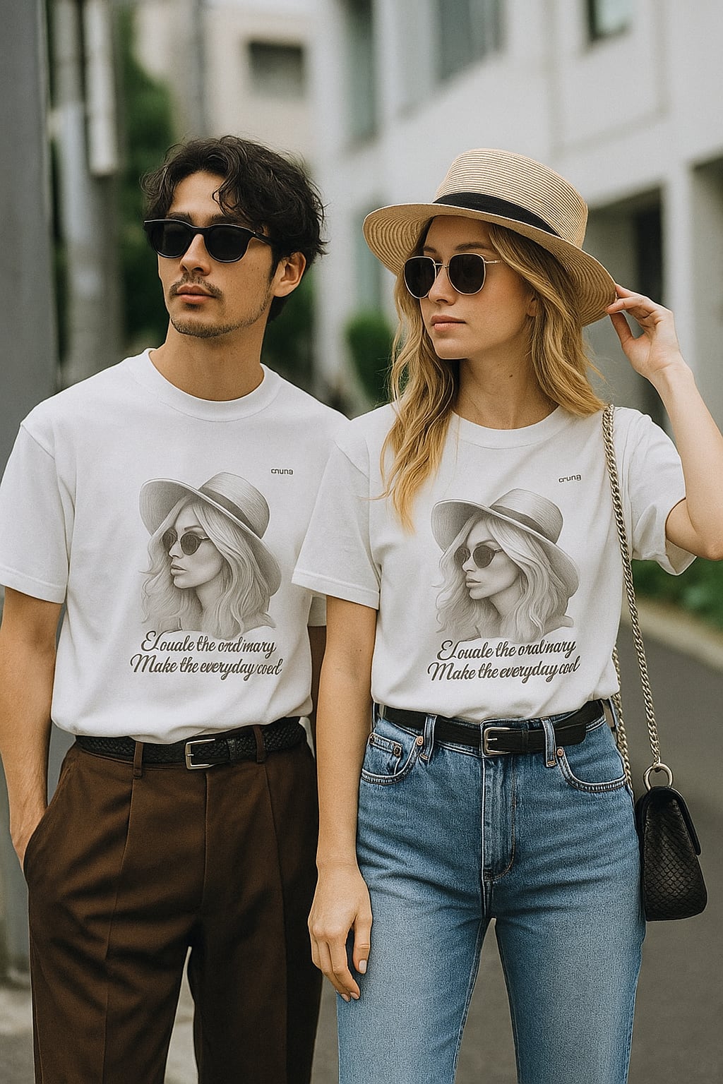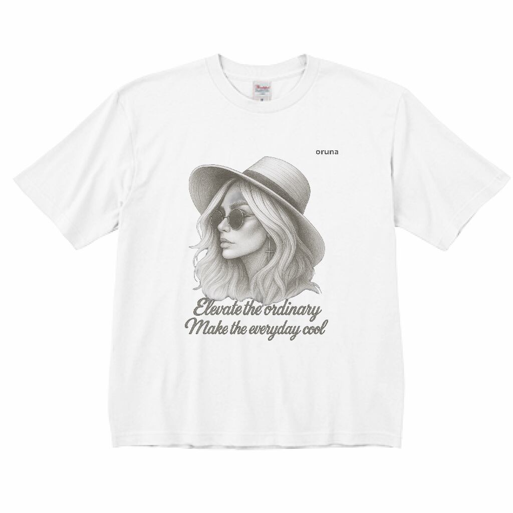 ハットとサングラスの女性を描いた鉛筆画風アートが映える、大人のためのグラフィックTシャツ。