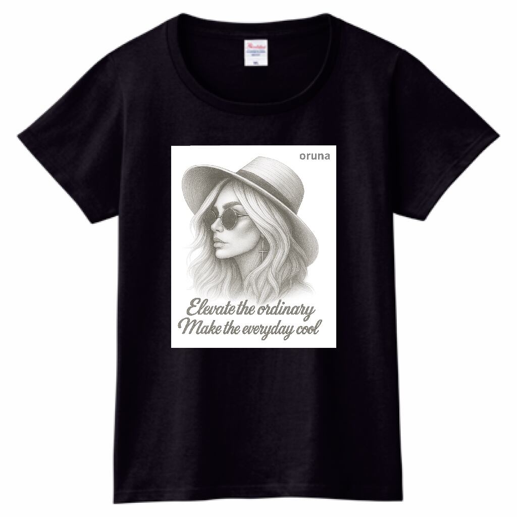 ハットとサングラスの女性を描いた鉛筆画風アートが映える、大人のためのグラフィックTシャツ。