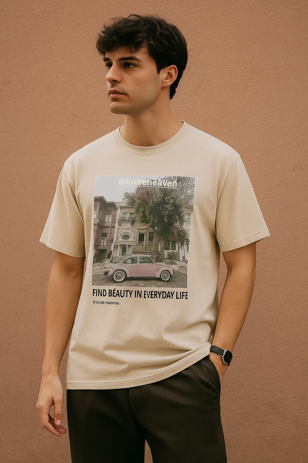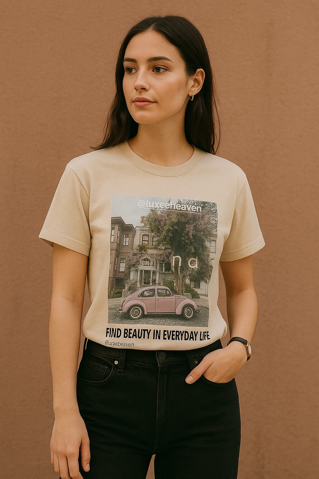 “Find Beauty in Everyday Life(毎日に美しさを)”というメッセージ入りで、日常コーデを格上げします。