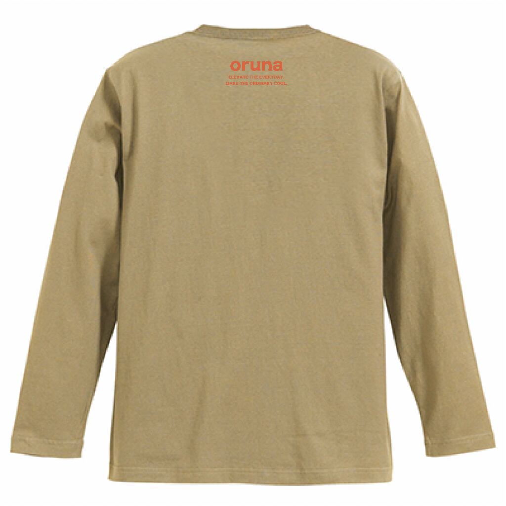 サンドカーキ色にオレンジのロゴが格好可愛いロングスリーブTシャツ