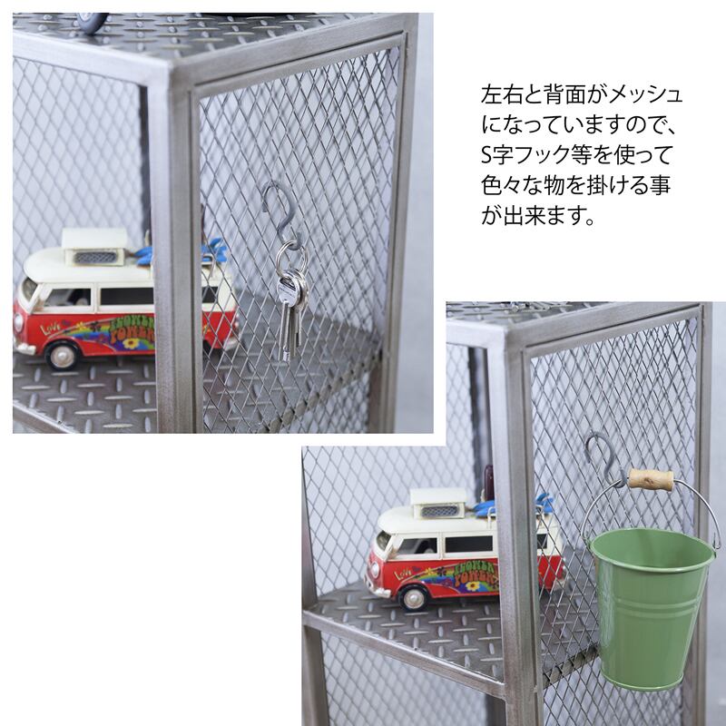 左右と背面はメッシュとなっていますのでS字フック等を使って、色々な物を掛けることが出来ます。