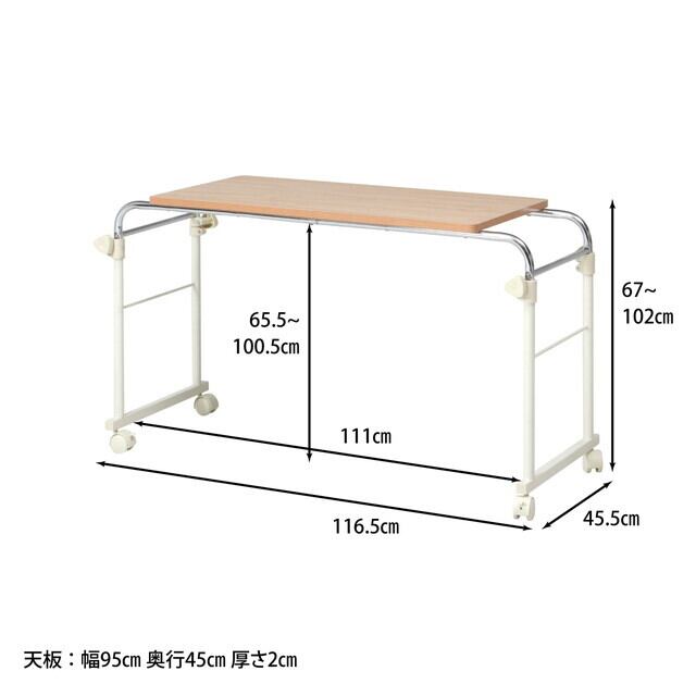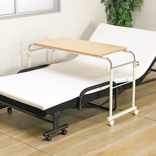 ベッドテーブル BT-302WHは、ベッドに座ったままでも快適に作業や食事ができる便利なテーブルです。介護用途にも最適で、ベッドに合わせて高さの調節が可能です。さらに、キャスター付きで移動もラクに行えるので、ベッド周りでの使いやすさが抜群です。