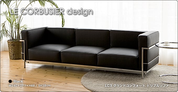 20世紀最も偉大な近代建築の巨匠 ル・コルビジュエの作品“LC3グランコンフォート”です。彼は建築においてもサヴォア邸、ロンシャン教会など数々の世界の建築史に残る作品を残してきた偉大な近代建築の巨匠です。 そして、この作品はグランコンフォート“GRAND COMFORT 「大いなる快適」”という意味で、単純な形で最大の快適さを得る事を目的とされており、金属パイプのフレームに革のクッションをはめ込むようにデザインされております。このLC3はコルビュジェの数あるデザインの中でも、大変評価が高い作品です。Mies、フランクロイドライトなどと並び、近代建築の20世紀の3大巨匠のひとり ル・コルビジュエの20世紀不朽の名作”LC3ソファ”をご体感して頂ければと思います。