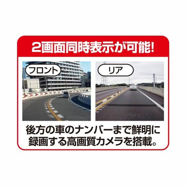 ●フロント+リア2カメラで死角が少ない。広範囲をカバーして撮影。高画質カメラで車のナンバーまで鮮明に録画できる。